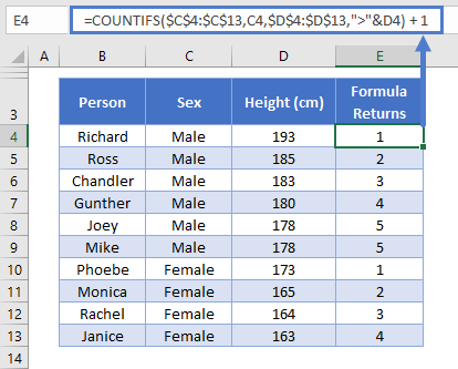 Rank within groups in excel. There is a formula to quickly rank values based on group. In this first picture, range e4:e13 is selected to call attention to the formula in cell e4 that uses a simple rank function of the scores from range b4:b13. While the overall ranking can easily be done using the rank function, the one for groups is a bit more complex. Includes numerous formula examples in excel and vba (with pictures). However, the excel rank function assigns ties with the same value, as shown below with . You copy and paste this formula in cell c1 down to cell c5. To assign a rank without ties, you can use the below formula. In plain language, you are asking the function to assign a rank to the value in c2 among all . After that, apply that formula to the end of the column, up to the . · the generic formula for the countifs function is: The rank of the first student's score in cell b2, enter this formula in cell c2:. Rank a number against a range of .